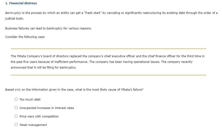 Solved 1 Financial Distress Bankruptcy Is The Process By Chegg Com